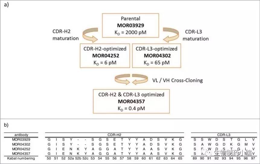 MorphoSys AG2016年發(fā)的文章[4]介紹了他們提高其自身的抗人GM-CSF抗體MOR103的親和力的工作。他們?cè)谥ぴ摽贵w與抗原的結(jié)合方式后,對(duì)抗體的CDR-H2和CDR-L3分別做隨機(jī)突變,并用噬菌體展示的方法篩選到高親和力的序列,之后再把篩到的重鏈與輕鏈配對(duì),得到一個(gè)新的“cross-cloned”抗體:
