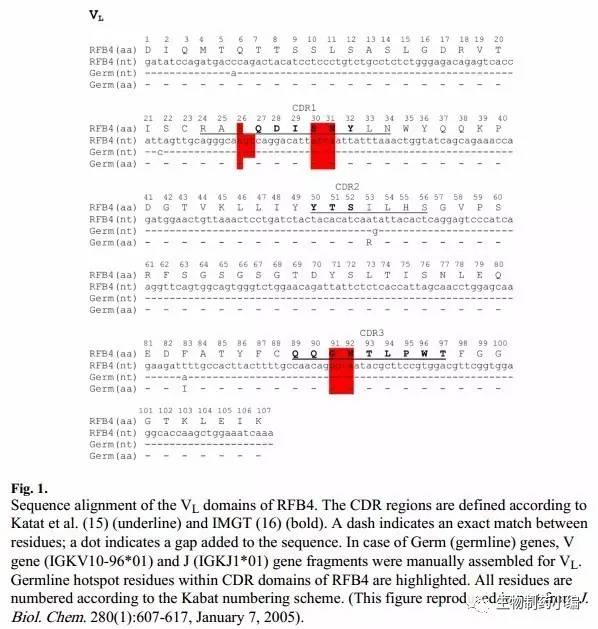隨后,他們對(duì)各批次的亞克隆細(xì)胞的V區(qū)基因做了序列比對(duì),找出了突變位點(diǎn),分析了抗體與靶點(diǎn)之間的構(gòu)效關(guān)系: